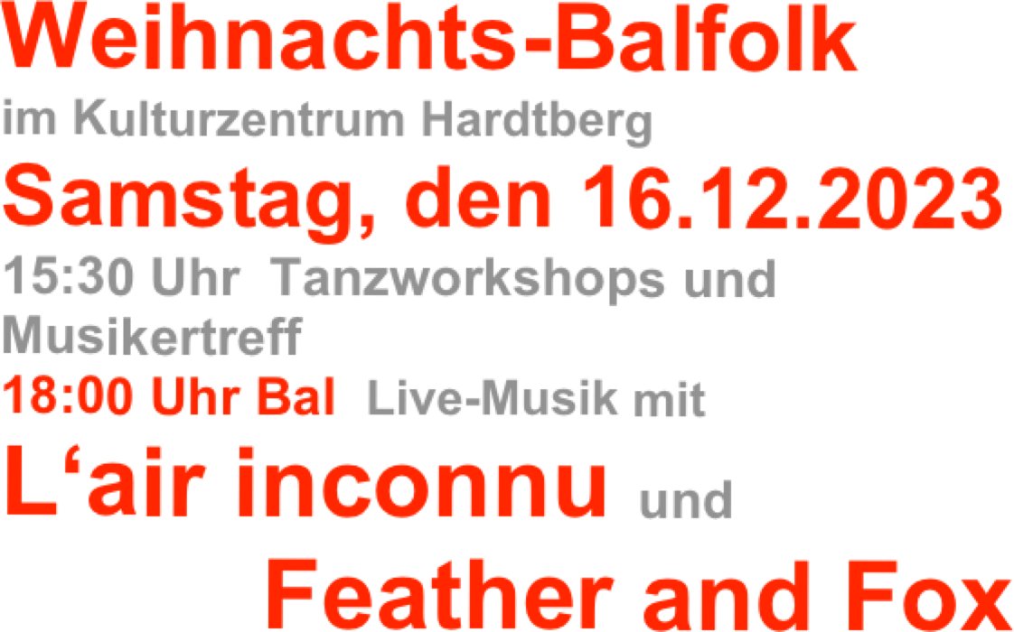 Das Kulturzentrum Hardtberg bietet uns samstags die Möglichkeit für lange Workshops, die in die Tiefe gehen. Diesmal planen wir die Branle d `Ossau und Basis Avant Deux im ersten Teil und Basis 2er und 3er Bourée in der zweiten Hälfte.